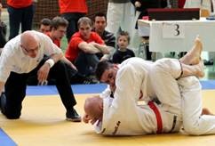 Doch nun zu den achten Deutschen Meisterschaften des DJJB selbst, welche wie beim Kau in einem Raum mit „Überdachung“: in der Glockenspitzhalle in Krefeld stattfanden: 274 Athleten aus allen Teilen Deutschlands waren angereist und angetreten, um die Deutschen Meister in den Kategorien Random Attack (Zufallsangriffe), Pairs (Technikdemonstration zu zweit, „Kür“), Kata (festgelegte Technikdemonstration, „Pflicht“), Bodenkampf (zu zweit) und Team (Teamdemonstration) auf vier großen Wettkampfmatten zu ermitteln – der älteste Jiu-Jitsuka, Alfred Giepen, war übrigens 72 Jahre alt und topfit! Die Schirmherrschaft seitens der Stadt Krefeld hatte Oberbürgermeister Gregor Kathstede übernommen, seitens des PSV Krefeld wurde die Schirmherrschaft vom ehemaligen Polizeipräsidenten von Krefeld, Dieter Friedrich, übernommen. Nach der feierlichen Eröffnung der Meisterschaften durch die Bürgermeisterin Krefelds, Karin Meincke, und feierlichen Worten des Präsidenten des Deutschen Jiu Jitsu Bundes, Dieter Lösgen (10. Dan Jiu Jitsu), welcher von der Stadt Krefeld für die besonderen Dienste im Jiu Jitsu mit dem Ehrenteller ausgezeichnet wurde, konnten die bestens vorbereiteten Wettkämpfer in ihren Alters-, Gürtel- und Gewichtskategorien an den Start gehen. Aber nicht nur die Wettkämpfer hatten sich gründlich auf die Deutschen Meisterschaften vorbereitet. Dies hatten auch die Punkt- und Mattenrichter getan. Erst eine Woche vor den Meisterschaften am 5. Mai 2012 waren diese zu einem abschließenden Lehrgang im Dojo an der Helmstraße des Turnerbund Frintrop e. V. (TBF) zusammengekommen, um Ablauf und Wettkampfregularien noch einmal abschließend zu besprechen. Die Wettkämpfe des DJJB sind mit Ausnahme der Kategorie Bodenkampf keine direkten Konfrontationen zwischen den Athleten, sondern ein technischer Vergleich, da Jiu Jitsu in erster Linie reine Abwehrtechniken beinhaltet. In der Kategorie Random Attack treten beispielsweise zwei Athleten mit ihren Partner gegeneinander im Vergleich an. Dabei führt der Partner einen ihm vorher bekannt gegebenen Angriff aus, der dem zu bewertenden Verteidiger jedoch unbekannt ist. Aus diesem Grund wird von den Punktrichtern die Reaktion auf den unbekannten Angriff, die Schnelligkeit und Dynamik sowie die Sauberkeit des technischen Vortrags bewertet.