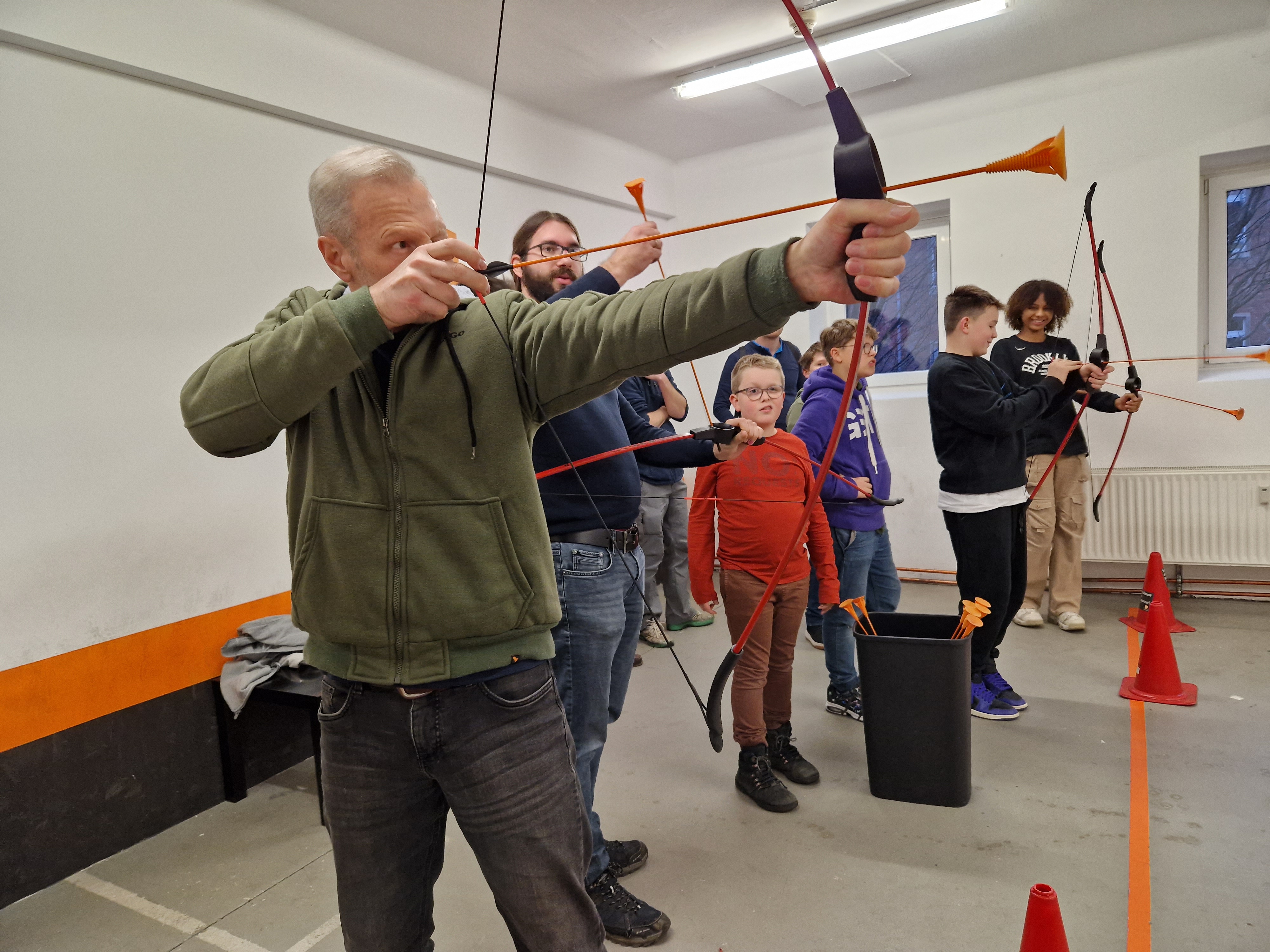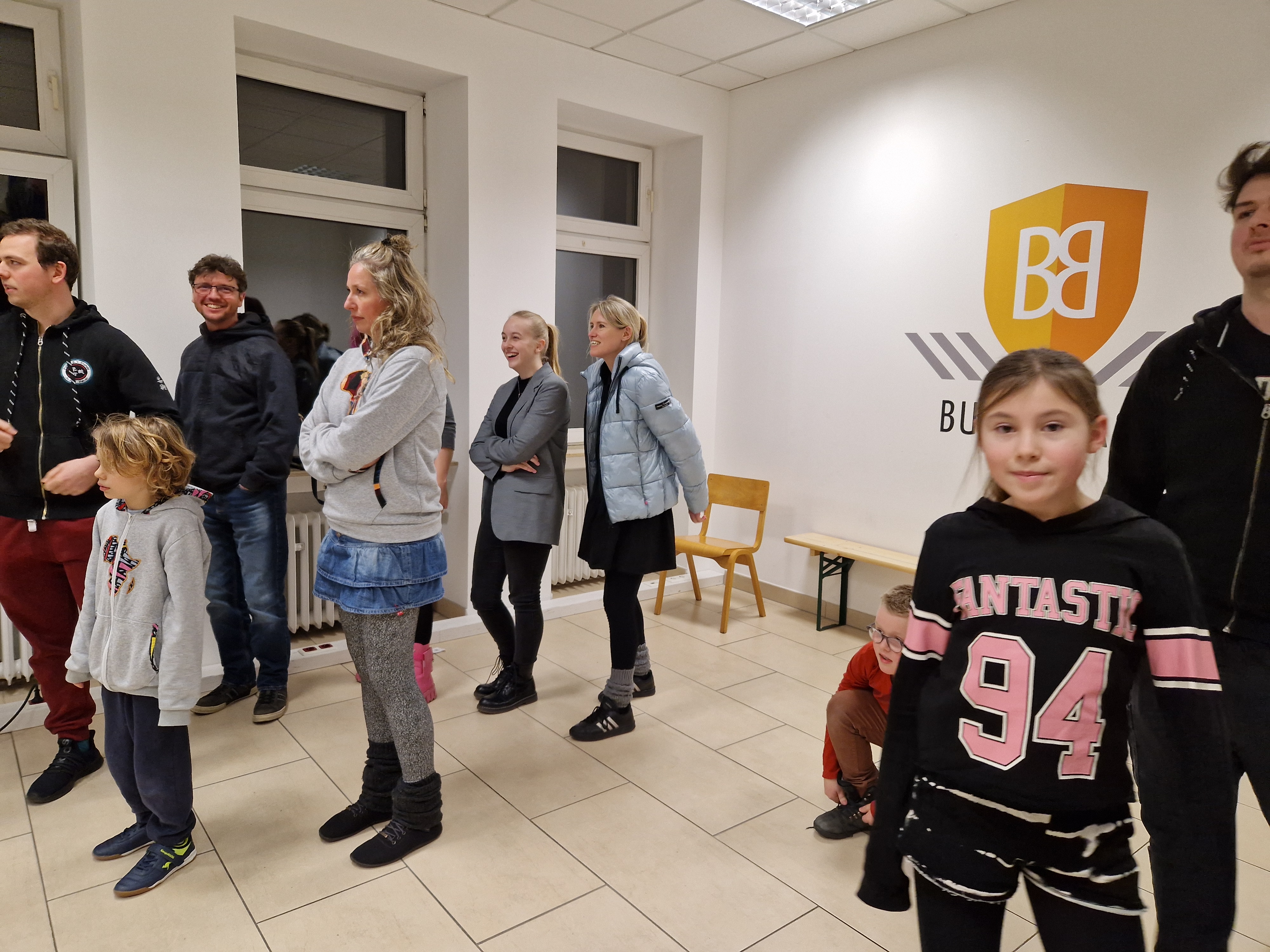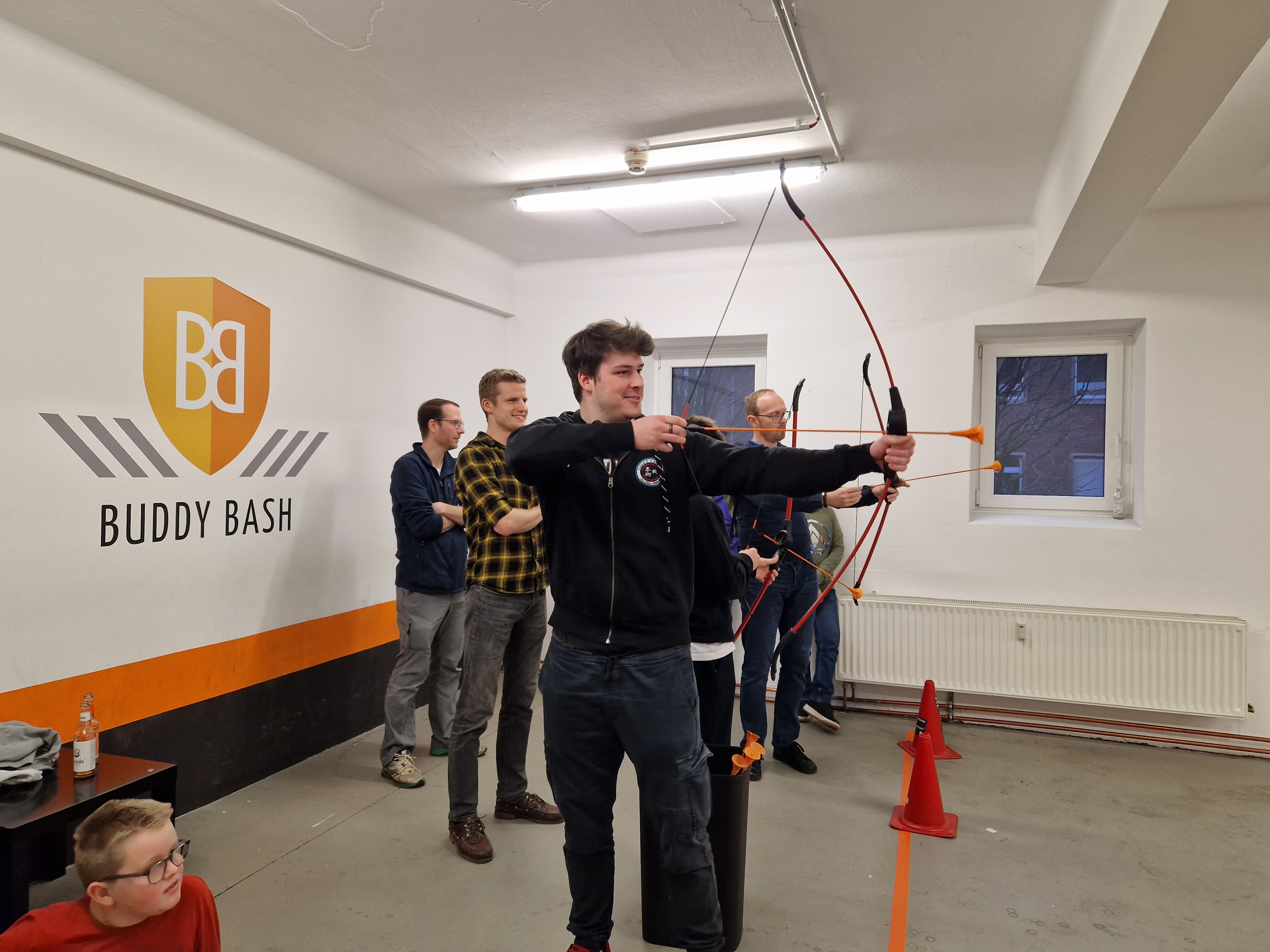 Gestern, am 28.01.23, wurde unsere Weihnachtsfeier nachgeholt. Thema dieses Mal war ein Gruppenevent namens Buddy Bash. Mit insgesamt 28 Personen haben wir uns in 4 Teams ein Battle geliefert, in dem es um Geschicklichkeit, Geschwindigkeit und Wissen ging. Die Teams wurden willkürlich zusammengesetzt und mussten ihren Teamgeist erst einmal zusammenbringen und organisieren. Die Aufgaben waren für jede Altersgruppe geeignet und alle Teilnehmer waren mit vollem Enthusiasmus dabei. Leider wurden gelegentlich richtige Antworten von Kindern überstimmt, fälschlicherweise auf medizinische Fachleute vertraut oder auf Bogenschützen gezählt. Trotz dieser Mieseren blieben die Teams aber geeint und stellten sich den nächsten Herausforderungen. Es war ein wirklich gelungener Nachmittag, der anschließend beim Essen am Abend seinen Ausklang fand. Die Wahl des Restaurants war evtl. nicht die beste Wahl aber das konnte die Stimmung nicht trüben.